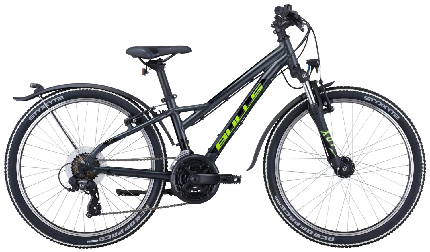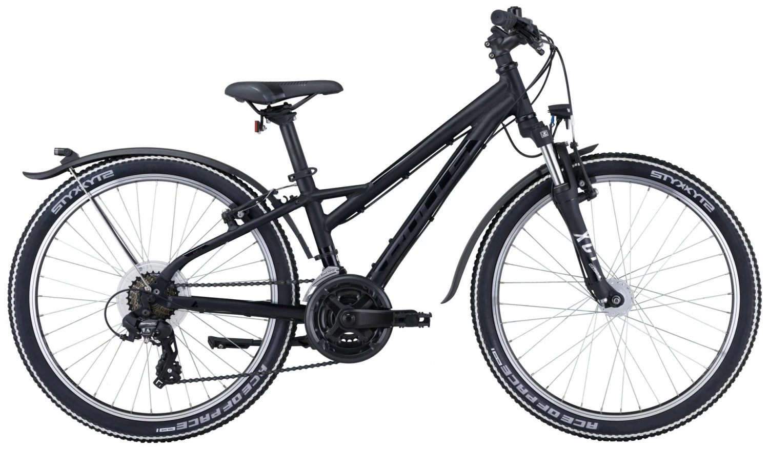 6061 Alu-Rahmen, Suntour XCT-JR Federgabel, 21-Gang Shimano Tourney Schaltwerk und Umwerfer, EZ-Fire Schalthebel, Alu Kurbeln, Alu HR-Nabe, Alu Felgen, Tektro V-Bremsen, Downhill-Lenker, Steckbleche, Nabendynamo, 30 Lux LED-Lampe, Standrücklicht, Ständer
