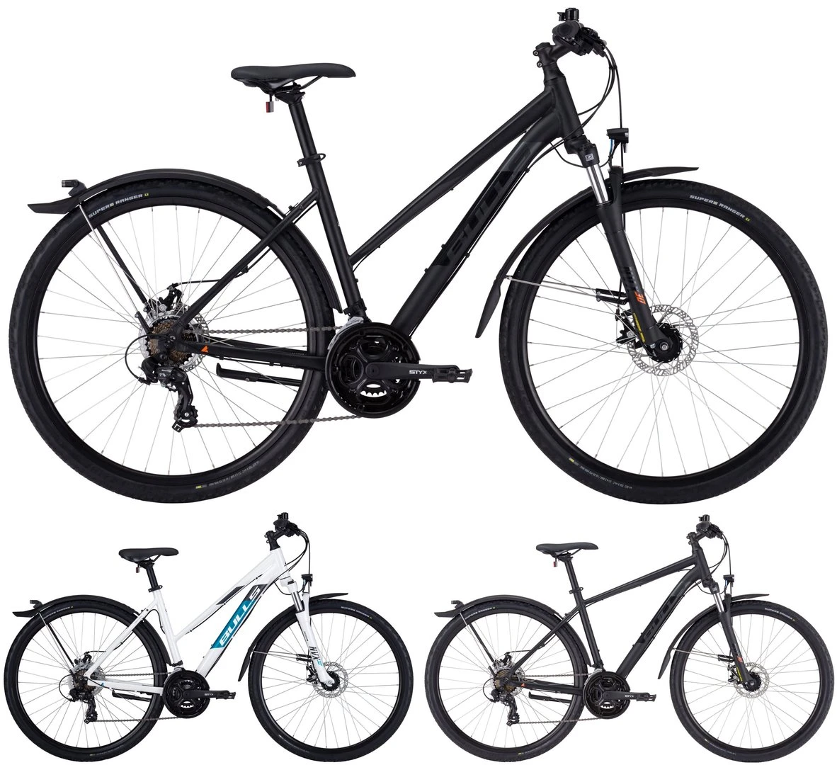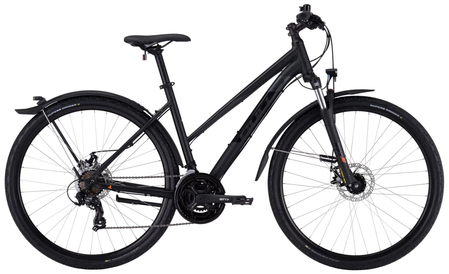 7005-Alu-Biaxial-Rahmen, Suntour NVX-30-DS Federgabel einstellbar, 21-Gang Shimano Tourney Schaltwerk und Umwerfer, Altus EZ-Fire Schalthebel, STYX Kurbeln, Tektro MD-M280 Disc-Bremsen (160/160mm), Formula HR-Nabe, Alu-Hohlkammerfelgen, Nabendynamo, 30 Lux LED-Lampe, Standrücklicht auf dem Schutzblech, Ständer, SKS Velo 55 Steckbleche mit Streben