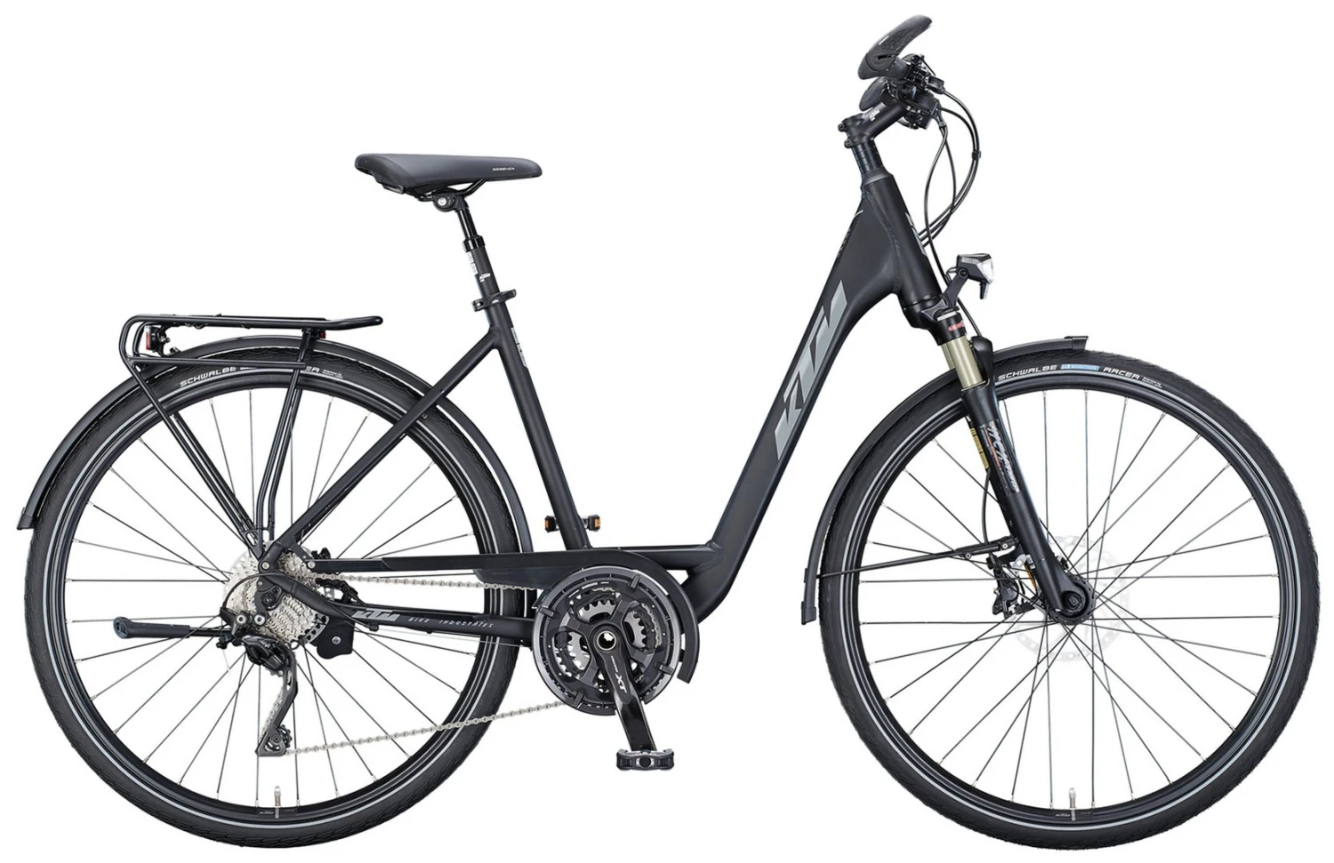 Alu 6061 triplebutted Rahmen für tapered Gabel, integrierte Lichtkabelverlegung und Steuersatz mit Lenkwinkelbegrenzer, Suntour NCX-E-LO Federgabel mit 63mm Federweg, 30-Gang XT Schaltwerk, Umwerfer, Schalthebel, Naben, Kurbeln und Disc-Bremsen, Deore Zahnkranz, Rival 23 Disc Felgen, Marathon Racer Reifen 40-622, 70 Lux LED-Lampe, Stand- und Tagfahrlicht, gefederte Satori Sattelstütze, Hebie Fix40 Ständer