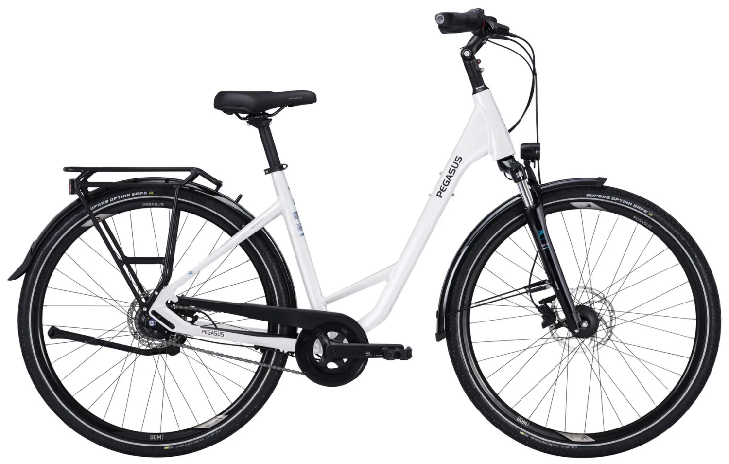 6061 Alu-Rahmen, Suntour NEX-DS einstellbare Federgabel, Nexus 8-Gang Nabenschaltung mit Rücktrittbremse und Revoshift Schalthebel, Tektro HD-T390 Scheibenbremsen mit 2,3mm Scheiben (160/180mm), DDM-2 Hohlkammer-Felgen, Supero Optima Safe Reifen 47-622, verstellbarer Vorbau mit 31,8mm Lenker, Ergon-Griffe, Nabendynamo, 50 Lux LED-Lampe, Standrücklicht, einstellbarer Hinterbauständer, Horn Catena Kettenschutz, Gummikralle Pedale